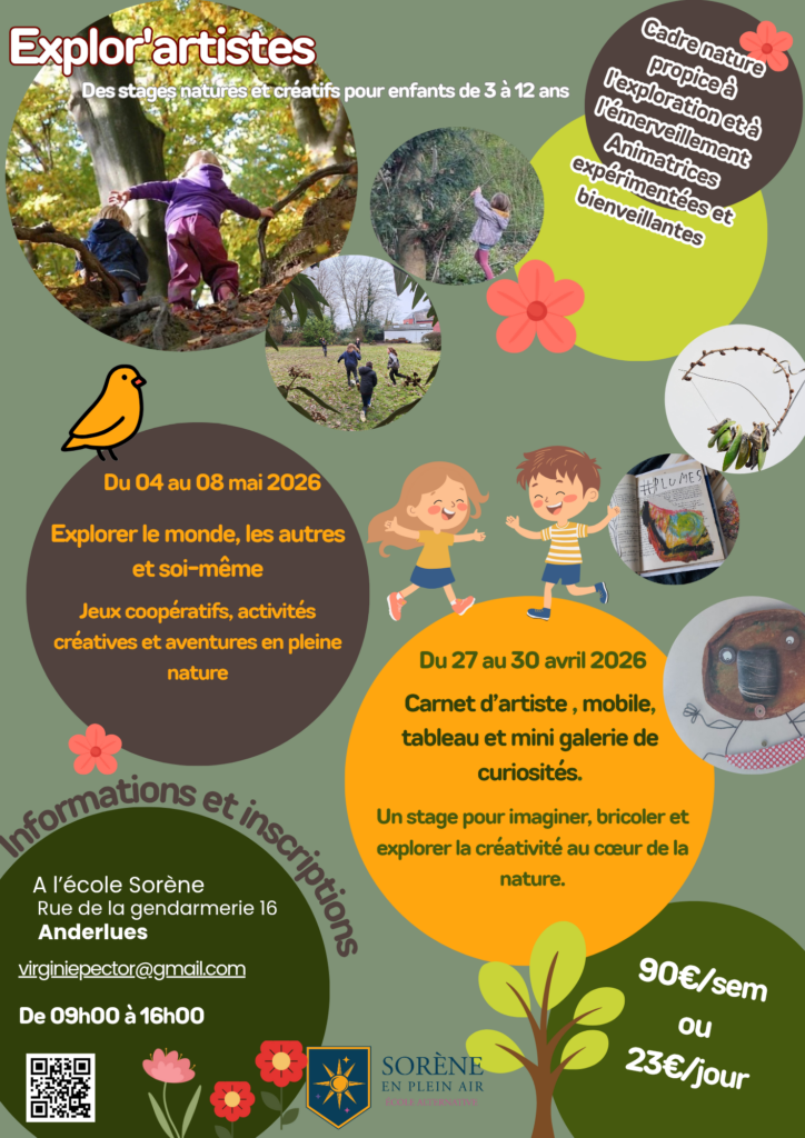 Stages printemps 2026 Et si vos enfants partaient à l’aventure… en pleine nature ? 🌿✨Les stages Explor’artistes invitent les enfants à explorer, créer et s’émerveiller à travers des activités ludiques et artistiques en extérieur. Entre jeux coopératifs, bricolages créatifs et découvertes, chacun peut développer son imagination, sa curiosité et sa confiance, dans un cadre bienveillant […]